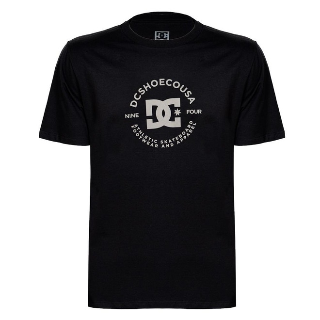 Camiseta Dc Shoes feita em modelagem regular, meia malha 30.1, estampa frontal e etiquetas personalizadas.