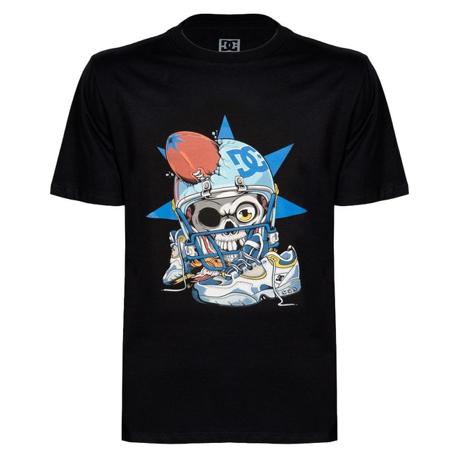 Camiseta Dc Shoes feita em modelagem regular, meia malha 30.1, estampa frontal e etiquetas personalizadas.