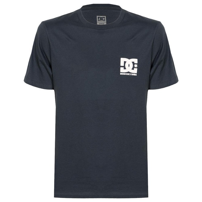 Camiseta Dc Shoes feita em modelagem regular, meia malha 30.1, estampa no peito e etiquetas personalizadas.