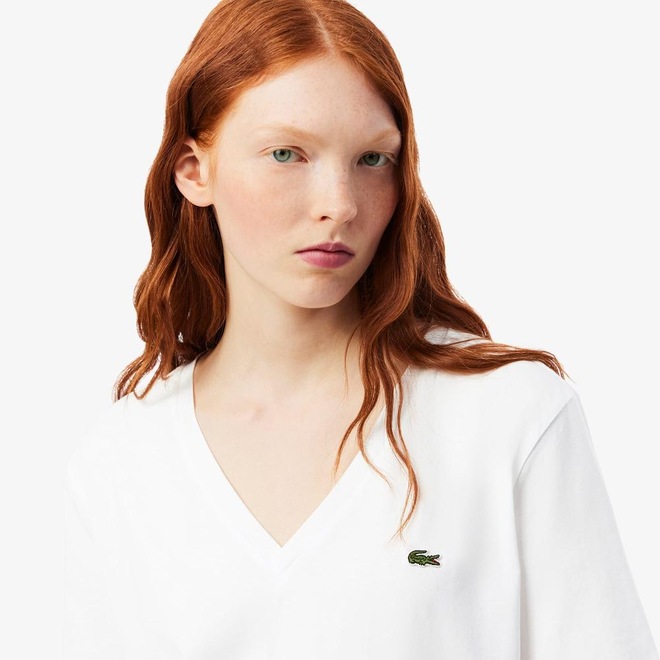 Apresentando um corte moderno, drapeado com ombros caídos em malha de algodão confortável: essa camiseta de gola V da Lacoste é um clássico por um motivo. Acabada com o nosso crocodilo bordado diferenciado.