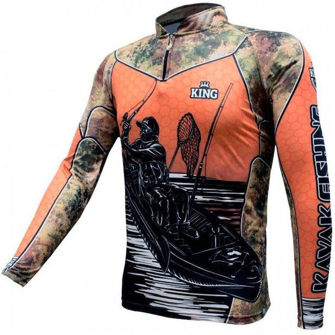 As camisetas sublimadas de pesca da King Brasil KFF 639 Caiaque são fabricadas com tecido 100% Poliéster com o DNA do fio modificado para que suas características durem a vida inteira do produto, proporcionando maior conforto e sensação térmica agradável, próprio para práticas de esportes como pescaria e outros esportes ao ar livre com foco em aventura.