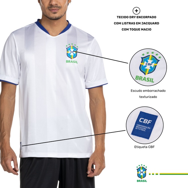 Escudo CBF (Confederação Brasileira de Futebol) Time Seleção do Brasil Tipo de Manga Manga Curta Gola Tira interna que diminui o atrito de contato junto à pele