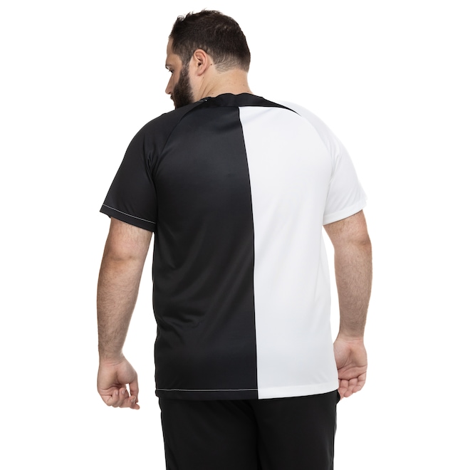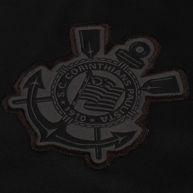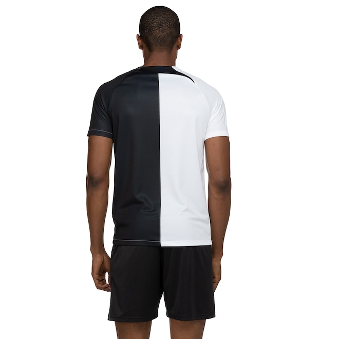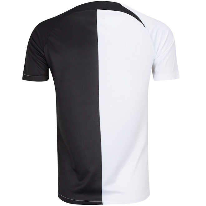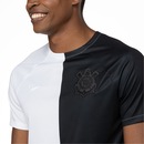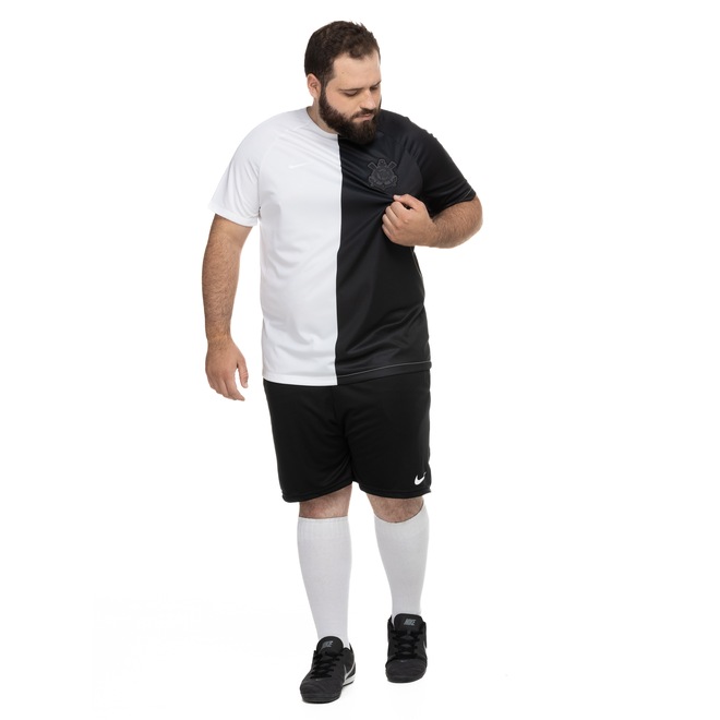 A camisa do Corinthians masculina é de mangas curtas, com gola careca.