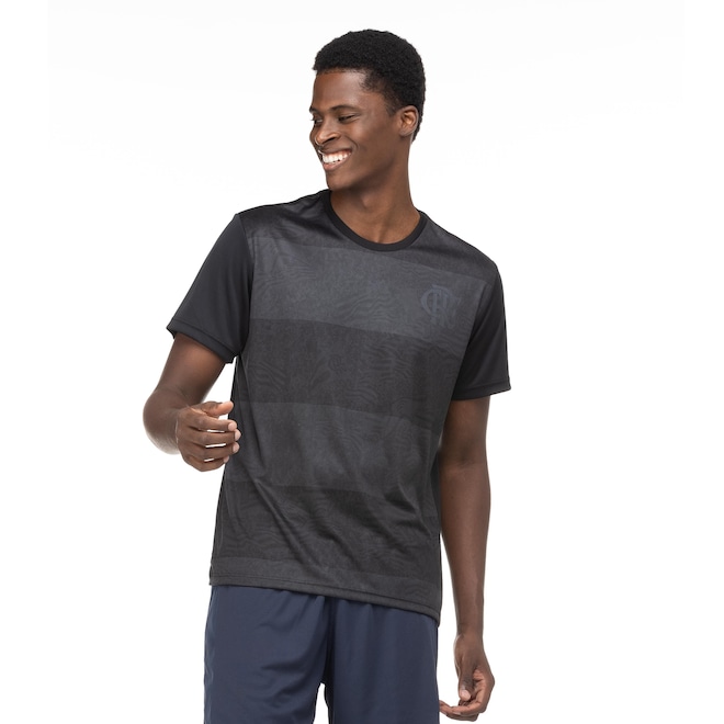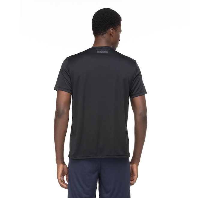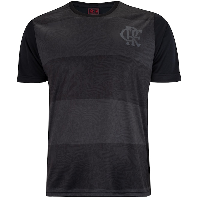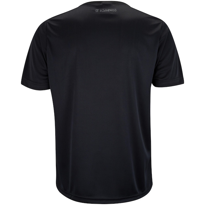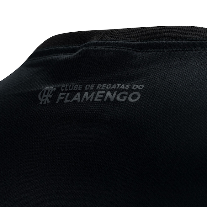 No predomínio da cor preto, possui estampa personalizada e o icônico escudo no lado esquerdo do peito.