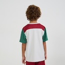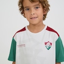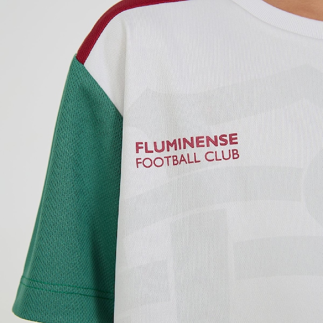O modelo apresenta design moderno com corpo branco, mangas verdes e detalhes em grená nos ombros. O escudo do Fluminense encontra-se estampado, enquanto o nome completo do clube aparece do outro lado. As costas são totalmente lisas, mantendo o visual limpo e elegante.
