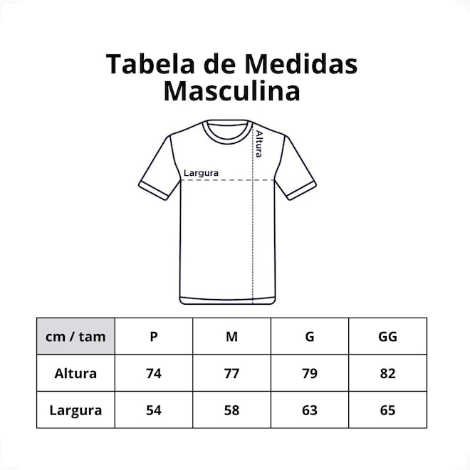 GG: Comprimento 82cm x Manga 28cm x Peito 65cm