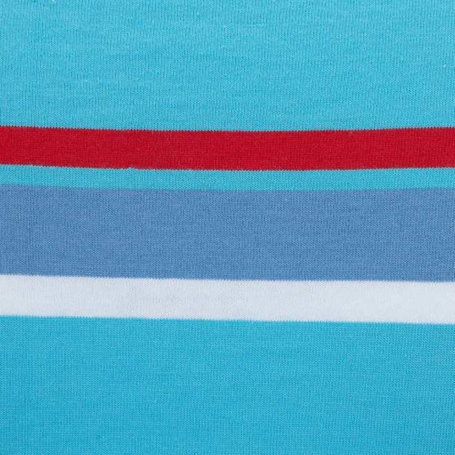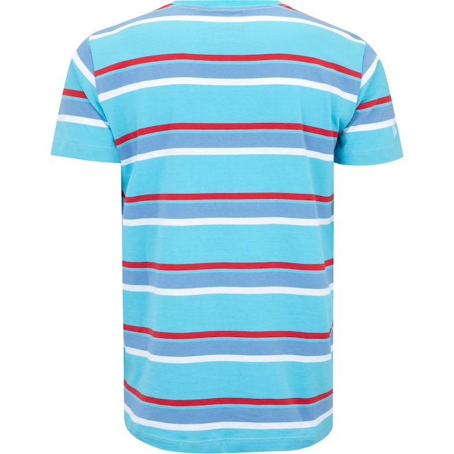 Possui mangas curtas e sua gola é careca, canelada e tem tira interna.