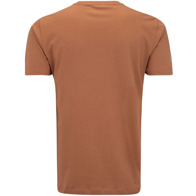 Conta com mangas curtas e sua gola é careca, canelada e tem tira interna.