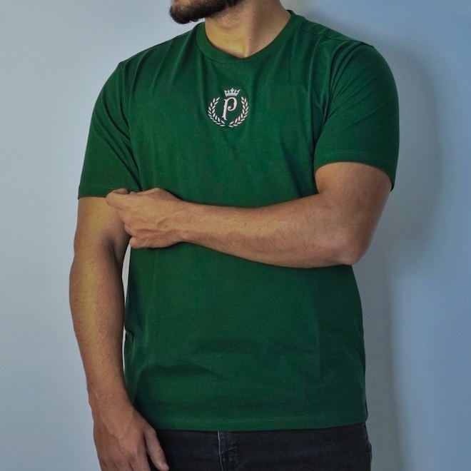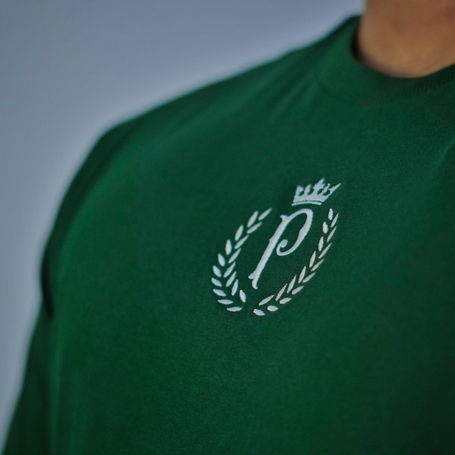 O destaque fica por conta do escudo bordado no peito, que traz a letra "P" envolta por um elegante ramo de louros e coroada no topo — um símbolo de tradição e estilo. O bordado de alta qualidade adiciona sofisticação ao visual, tornando a peça perfeita para quem valoriza detalhes marcantes.