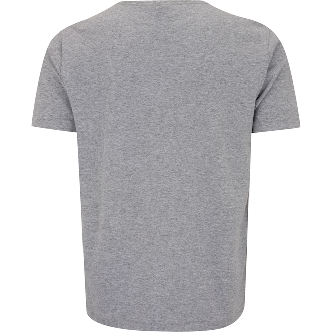 Possui mangas curtas e sua gola é careca, canelada e tem tira interna.