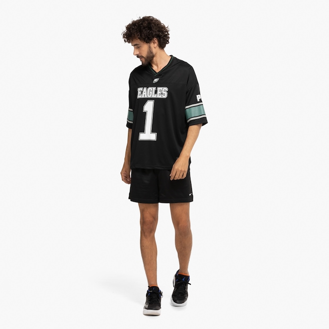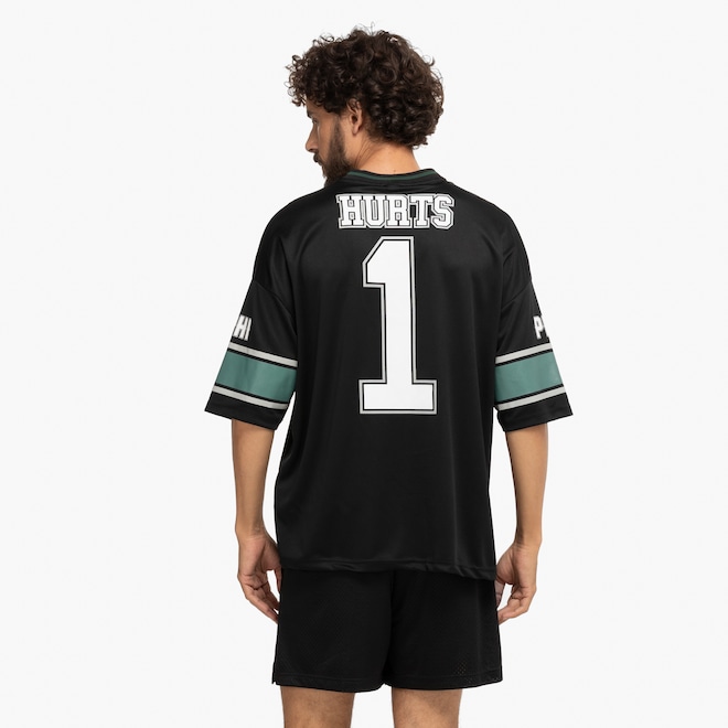 Confeccionada em tecido leve e respirável, mantém o corpo confortável durante qualquer atividade. Com design oficial do Philadelphia Eagles e detalhes do quarterback Jalen Hurts, é a escolha ideal para torcedores que querem demonstrar apoio e conexão com o time em cada momento.