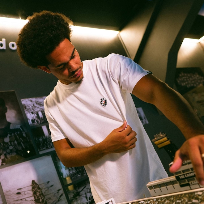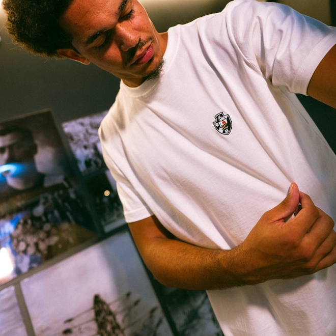 Composta por meia malha strong (175g/m²), entrega um caimento estruturado e toque macio. A gola em ribana canelada reforça o acabamento, enquanto os bordados autorais dão voz a histórias que se refletem em cada detalhe.