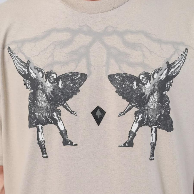 Uma tempestade raios, retratada em azul e preto, em meio ao crepúsculo do mundo, onde o brilho do relâmpago ilumina o horizonte sombrio e os anjos vigiam em cima.ref: M17BOG