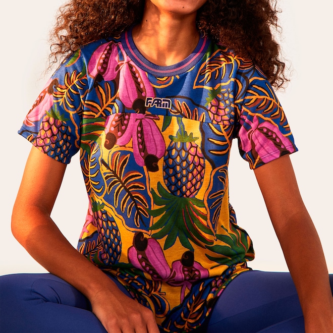 A Farm é sinônimo de muito estilo nas composições, por isso a camiseta feminina Sublimada Sonho de Fruta. A gola é careca e canelada, suas mangas são curtas e sua estampa personalizada. Ainda conta com barra com recorte arredondado e tecido em poliéster, garantindo muito mais conforto durante o uso. Compre já!
