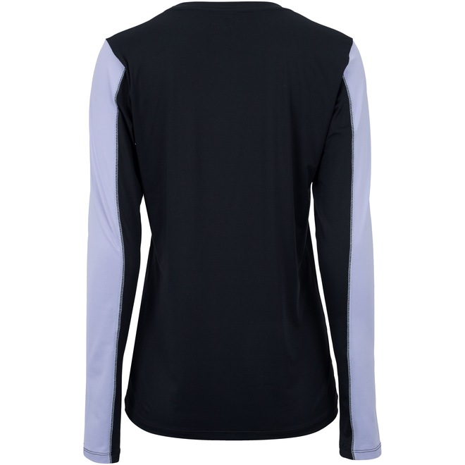 Tem mangas longas e sua gola é careca com tira interna que protege do atrito.