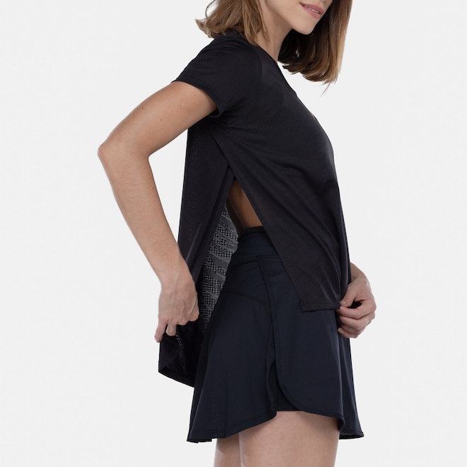 Seu design moderno conta com aberturas laterais que proporcionam maior ventilação e liberdade de movimento, garantindo conforto em atividades de alta intensidade.