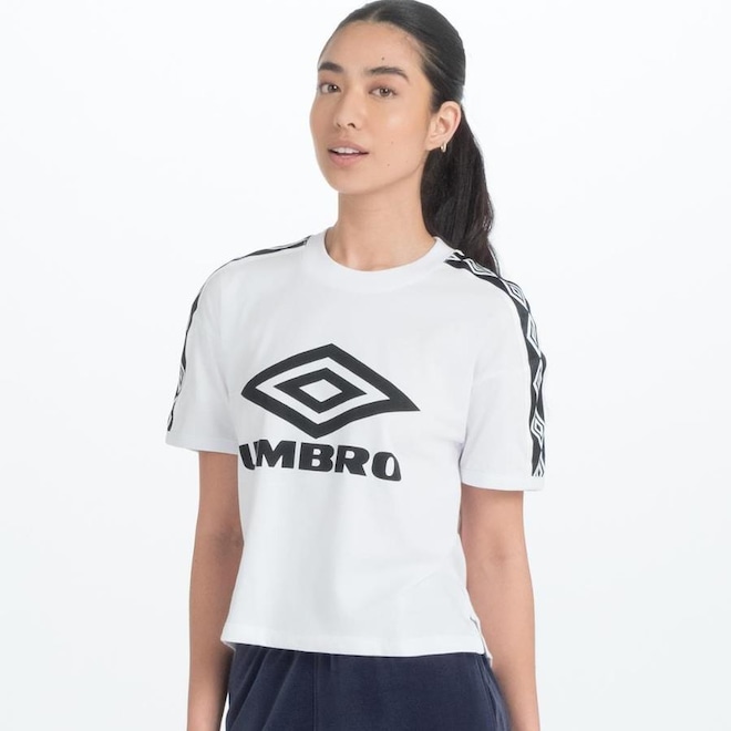 Camiseta feminina confeccionada em meia malha premium de algodão. Modelagem um pouco mais curta que a regular, com gola careca em ribana e manga curta. Possui tape Umbro personalizado aplicado no ombro e nas mangas, aberturas laterais na barra, cobre gola com tape personalizado e maxi logo Umbro em silk centralizado na parte frontal superior.ref: M14198