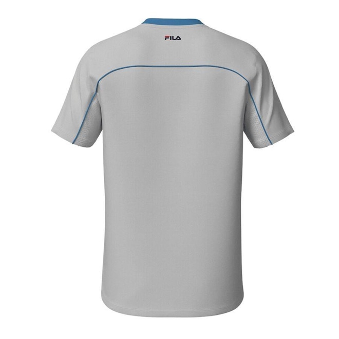 Camiseta masculina confeccionada em malha de poliéster com elastano e recorte na parte interna das mangas em Mesh de poliéster para melhorar a respirabilidade, indicada para a prática de exercícios. Modelagem regular com gola careca contrastante em ribana ecológica e manga curta. Produto ecológico com certificado Oeko-Tex, que testifica o não uso de químicos nocivos na sua fabricação. Seu tecido contém as tecnologias FLOW, que oferece secagem rápida e mantém o corpo na temperatura ideal para a prática esportiva, e a UV PROTECTION, que fornece proteção solar FPS 50+ dos raios UVA e UVB. Possui vivo horizontal aplicado na parte superior e nas mangas, recorte frontal superior em malha sustentável de poliéster reciclado, patch F-Box em termo aplicado na parte frontal esquerda superior e logo Fila Letter bicolor em termo centralizado abaixo da gola nas costas.