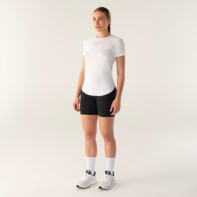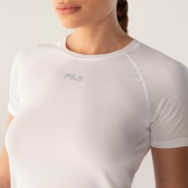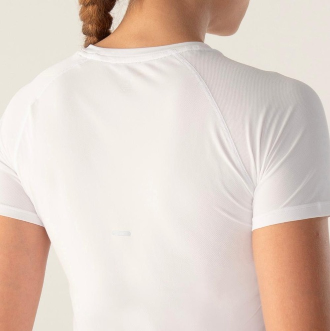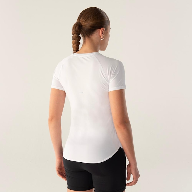 Blusa feminina confeccionada em malha leve de poliamida, com textura sarjada. Modelagem regular com manga curta raglan, indicada para a prática de exercícios. Contém as tecnologias BIOTECH, que controla a proliferação de bactérias; e a FLOW, que aumenta a hidrofilidade, oferece secagem rápida e mantém o corpo na temperatura ideal para a prática esportiva. Possui costuras Flat Seam, laterais deslocadas para maior conforto e barra traseira com comprimento maior que a barra frontal.