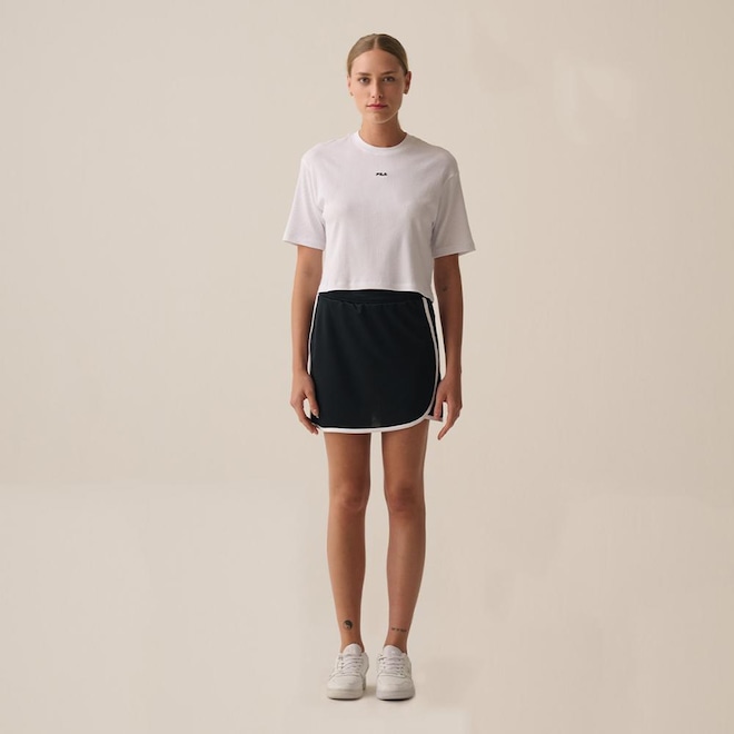 - Sobre o produto Camiseta feminina confeccionada em meia malha canelada de viscose com elastano. Modelagem regular com gola careca pespontada e manga curta. Possui bordado Fila Letter centralizado na parte frontal superior.- ref: M17LUC