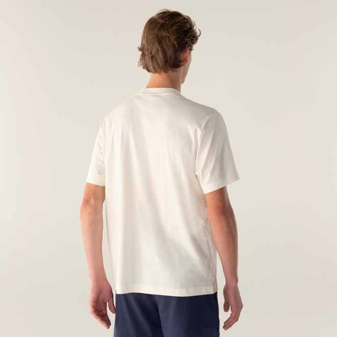 Camiseta masculina feita em malha de algodão na modelagem comfort. Possui gola em ribana com pesponto duplo e acabamentos nas mangas e barra. Destaque para o silk FILA F-Box de 20 cm na frente, que reforça a elegância clássica da marca.