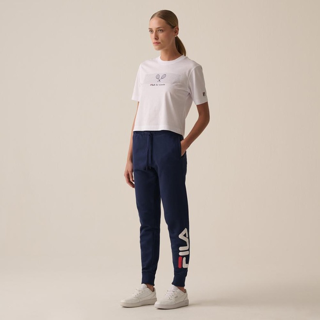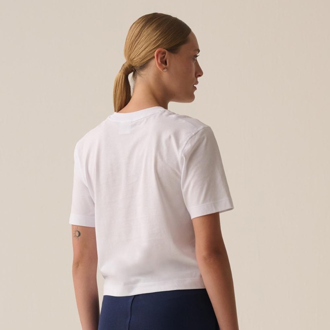 Camiseta feminina confeccionada em meia malha 100% algodão. Modelagem comfort, mais solta no corpo, com gola careca pespontada em ribana e manga curta. Produto ecológico com selo BCI (Better Cotton Initiative) e processo de lavagem com amaciante natural de arroz, elaborado para causar menos impacto ao meio ambiente, proporcionar boa capacidade de transpiração e toque macio. Possui cobre gola institucional, ombros deslocados para trás e cavas com costura rebatida, estampa gráfica Fila for Tennis em silk centralizada na parte frontal superior e patch F-Box aplicado na manga esquerda.