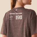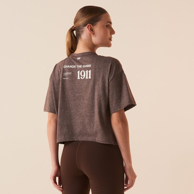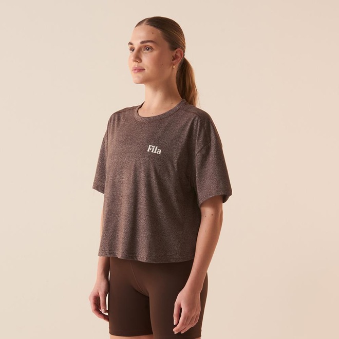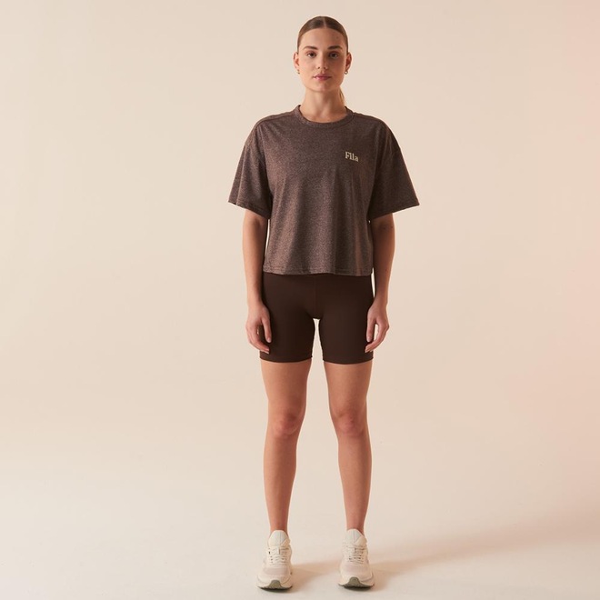 Camiseta feminina confeccionada em malha mescla de poliéster e algodão, indicada para treinos de baixa e média intensidade. Modelagem oversized, bem solta no corpo, com comprimento na altura do cós, gola careca e manga curta. Possui costuras laterais deslocadas para frente, queda de ombro, barra frontal com comprimento maior que a barra traseira, etiqueta bandeira Fila aplicada na na gola traseira e estampas variadas à base dágua.ref: M17LUZ