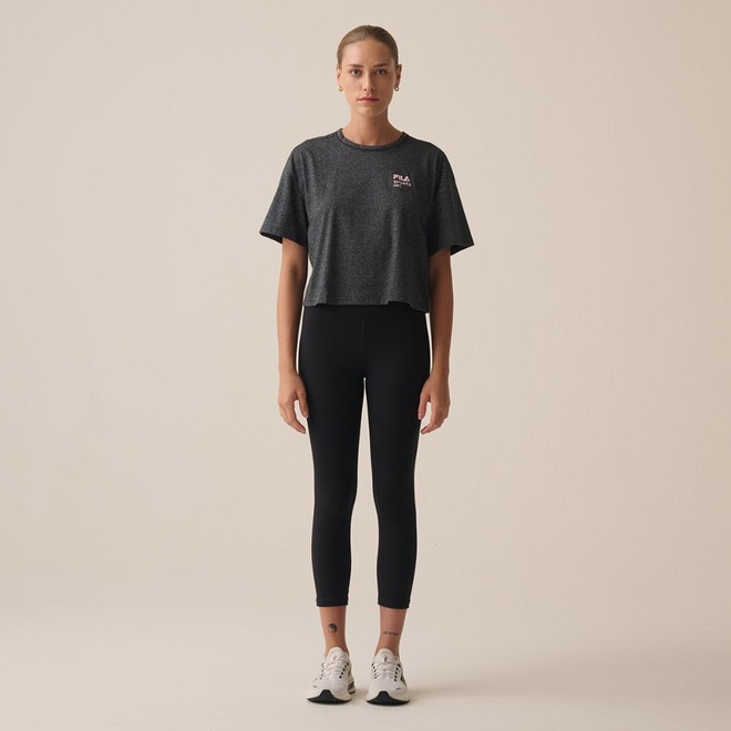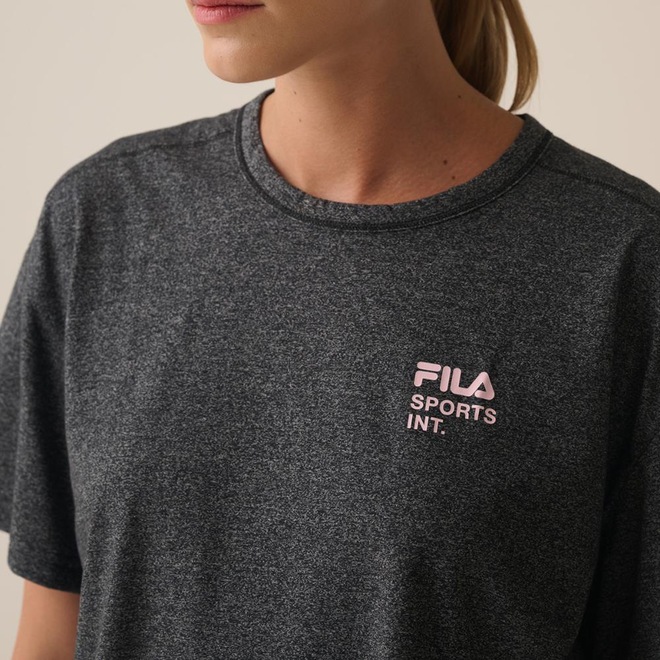 Camiseta feminina confeccionada em malha mescla de poliéster e algodão, indicada para treinos de baixa e média intensidade. Modelagem oversized, bem solta no corpo, com comprimento na altura do cós, gola careca e manga curta. Possui costuras laterais deslocadas para frente, queda de ombro, barra frontal com comprimento maior que a barra traseira, etiqueta bandeira Fila aplicada na na gola traseira e estampas variadas à base dágua.ref: M17LV2