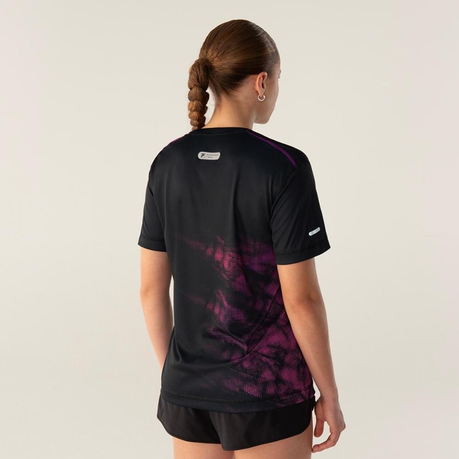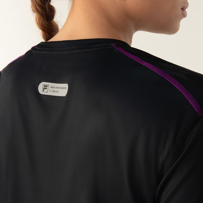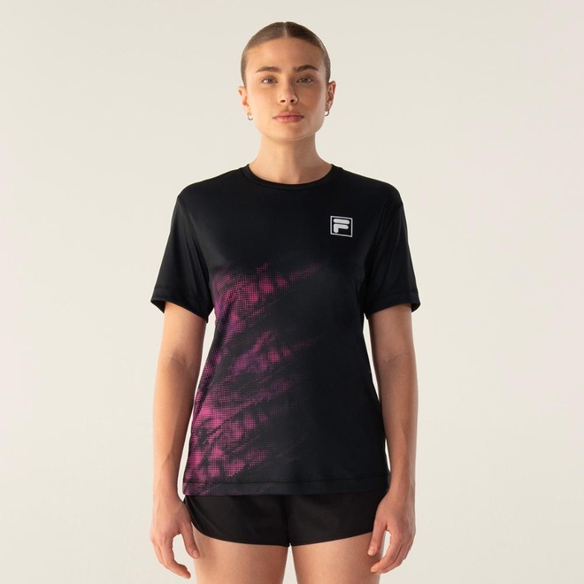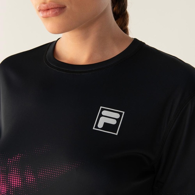 Camiseta feminina confeccionada em malha leve de poliéster. Conta com tecnologia FLOW, que acelera a evaporação do suor, e UV PROTECTION FPS 50+, que bloqueia raios UVA e UVB. A modelagem comfort apresenta gola e cavas com acabamento pespontado contrastante, FILA Bars refletivo nas mangas e estampa Gradient Halftone sublimada na lateral. Logo refletivo F-Box frontal e assinatura F-Box High Performance & High Style refletiva nas costas.