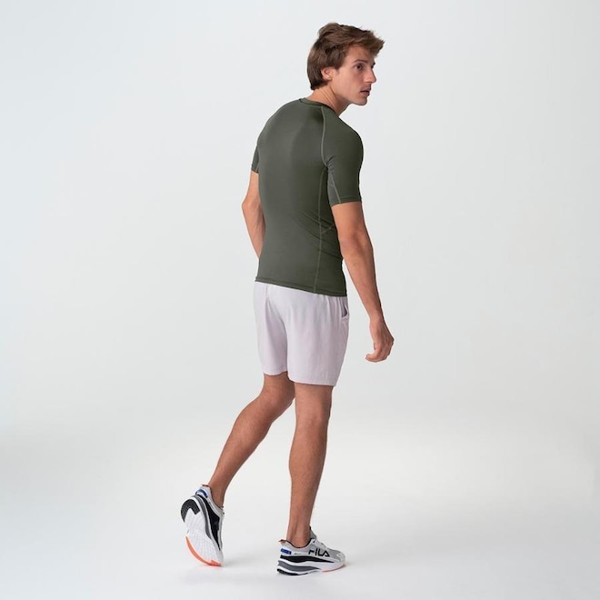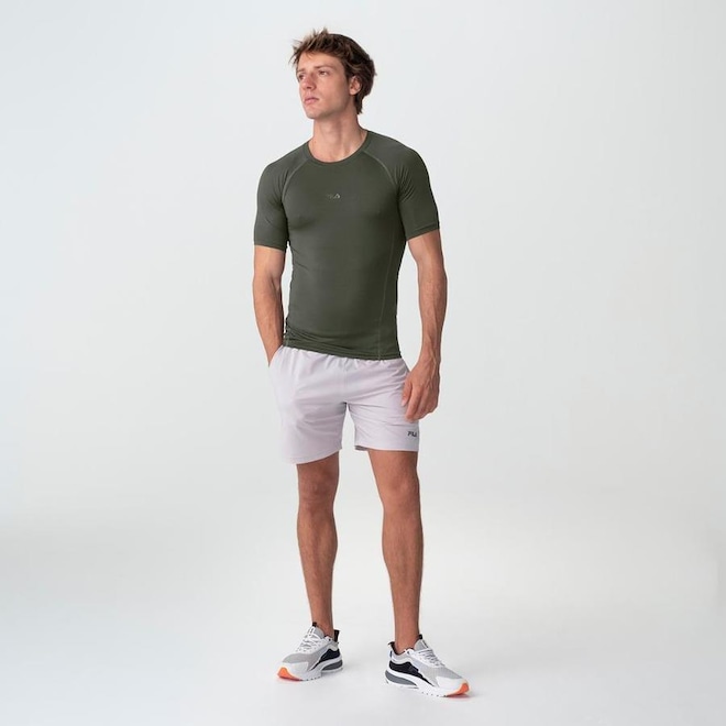 Camiseta masculina de compressão confeccionada em malha fina leve de poliéster com elastano. Modelagem skin, bem justa no corpo, ideal para ser usada como segunda pele com foco em exercícios alta performance. Contém a tecnologia UV PROTECTION, que oferece proteção solar FPS 50+ dos raios UVA e UVB, e a tecnologia FLOW, que mantém o corpo na temperatura ideal para a prática esportiva, proporcionando maior conforto e rápida secagem. Possui manga curta raglan com costura sem atrito com a pele durante os movimentos, cobre gola interno personalizado com Tape Fila Performa, recortes anatômicos que valorizam a musculatura masculina e logo Fila Letter em gel centralizado na parte frontal próximo à gola. VERDE OLIVAref: M0ZVQ2