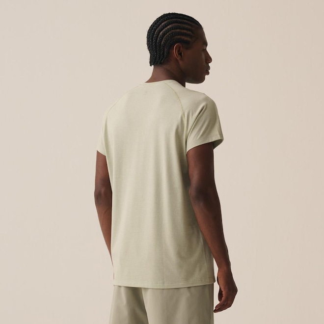 Camiseta masculina confeccionada em malha mista texturizada com 50% de poliéster e 50% de algodão, indicada para treinos de média e baixa intensidade. Modelagem regular com manga curta raglan e gola careca. Possui laterais deslocadas para frente com costuras flat (sem atrito com o corpo), cobre gola pespontado e logo Fila Letter em termo centralizado na parte frontal superior.