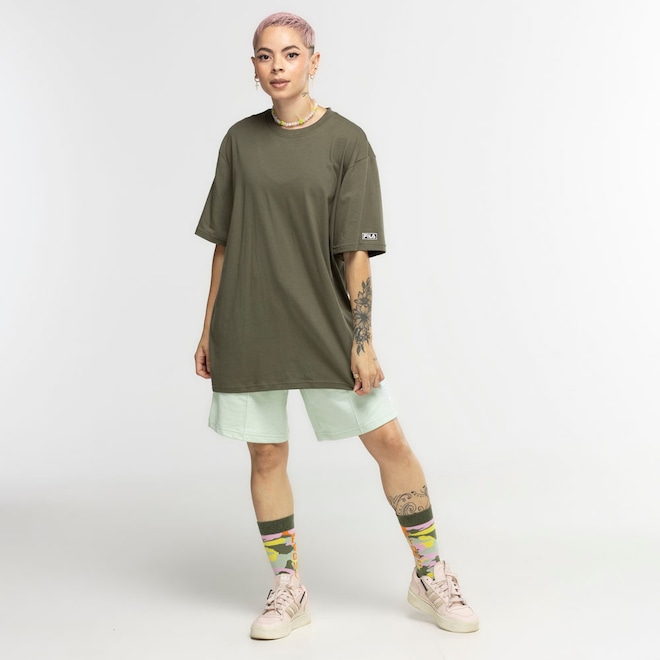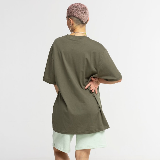 A camiseta Essential Over tem mangas curtas e sua gola é careca com tira interna.