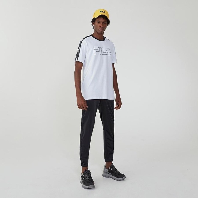 Contém Tape Fila Letter personalizado aplicado nos ombros e nas mangas e logo Fila Letter Outline em silicone com relevo centralizado na parte frontal.
