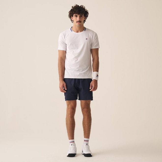 - Sobre o produto Camiseta Masculina FILA Match AO combina tecnologia e conforto para garantir o melhor desempenho. Produzida em malha de poliéster com elastano, conta com modelagem regular e tecnologias como Flow e FPS 50+, que proporcionam respirabilidade e proteção contra os raios solares. Possui gola em retilínea e recortes em mesh nas laterais da barra. O acabamento em 2 agulhas e o F-Box em termo no peito, do lado esquerdo, completam o visual esportivo e funcional.- ref: M17LW5