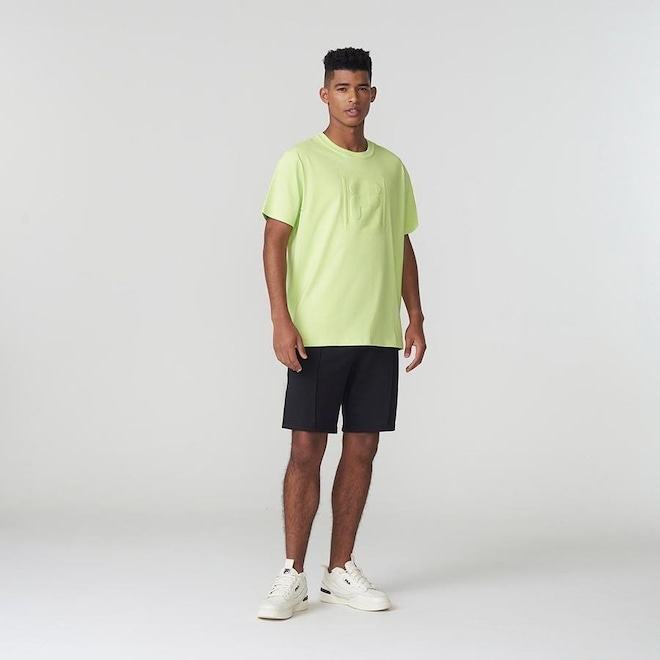 Possui gola careca em ribana com acabamento diferenciado em viés, ombro pespontado, maxi logo F-Box com relevo centralizado na parte frontal e patch Fila Stack aplicado na parte traseira próximo à gola.
