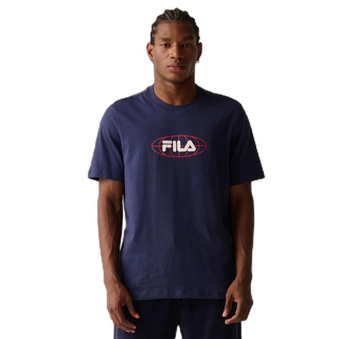 Camiseta masculina confeccionada em meia malha 100% algodão. Modelagem regular com gola careca em ribana e manga curta. Produto ecológico com selo BCI (Better Cotton Initiative), que assegura a produção sustentável de algodão. Possui etiqueta bandeira Fila aplicada na lateral esquerda e estampa gráfica Fila World em silk centralizada na parte frontal superior.