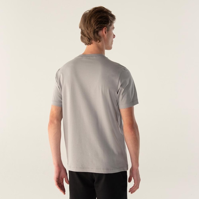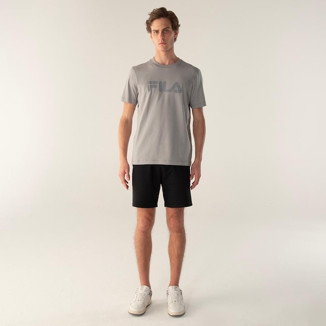 Camiseta masculina feita em algodão com certificações OEKO-TEX e BCI. Possui modelagem regular, gola em ribana, barra com fendas laterais e pesponto duplo nos acabamentos. A estampa FILA Linear em silk na parte frontal destaca o logo da marca, unindo sustentabilidade e estilo básico.