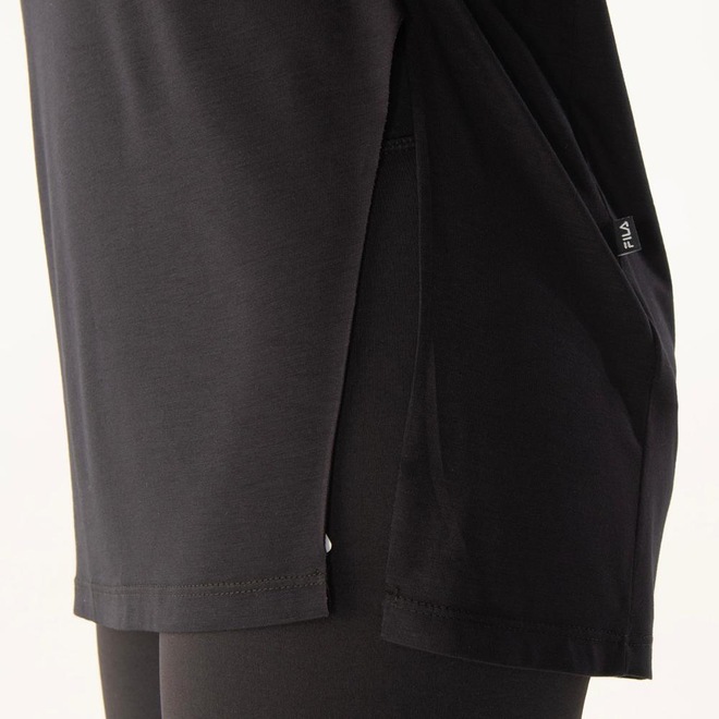 Camiseta feminina confeccionada em malha de algodão ecológico com elastano, que oferece conforto e leveza durante o uso. A modelagem conta com gola aplicada e cobregola no mesmo tecido do corpo, além de um nó diagonal próximo à lateral, finalizado com fenda, conferindo um toque moderno à peça. A assinatura de marca vem com a etiqueta FILA Linear aplicada na lateral esquerda e tampografia posicionada abaixo da gola na parte traseira.