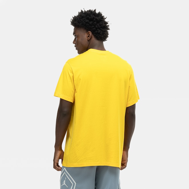 Conta com mangas curtas e sua gola é careca com tira interna.