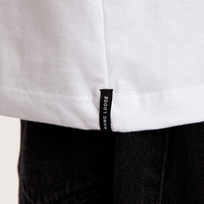 Camiseta Hang Loose feita em meia malha 30.1, silk frente 1 cor e etiqueta Hang Loose.