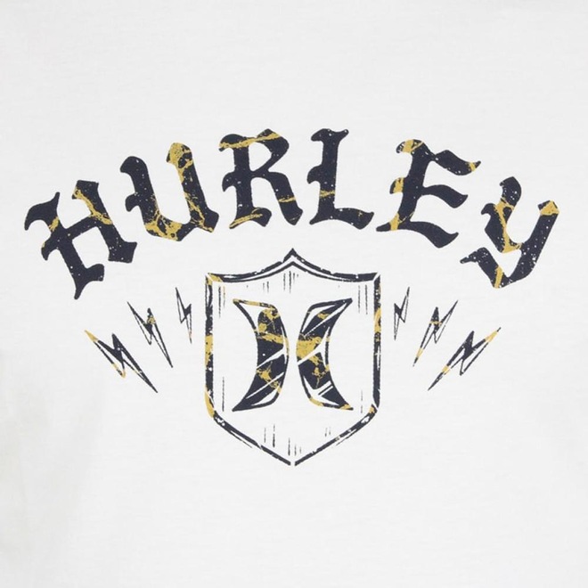 Camiseta Hurley feita em meia malha 30.1, gola rebatida, estampa localizada base d''agua e etiqueta clips ONE&ONLY na barra.