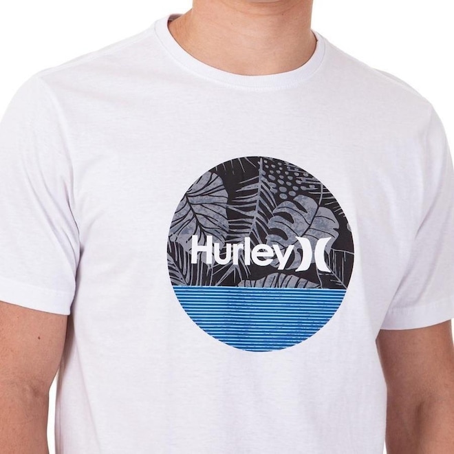 Camiseta Hurley meia malha 30.1, gola rebatida, estampa localizada base d'água e etiqueta clips na barra.