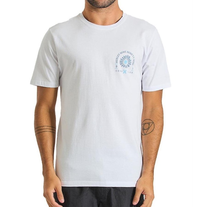 Camiseta Hurley feita em meia malha 30.1, gola rebatida, estampa localizada base d''agua e etiqueta clips ONE&ONLY na barra.
