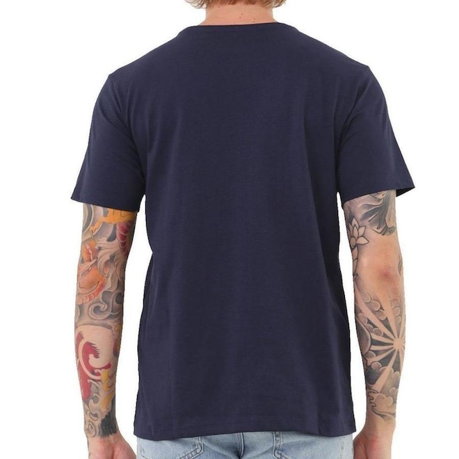 Camiseta Silk, meia malha 30.1, gola rebatida, estampa localizada base dágua e etiqueta clips na barra.