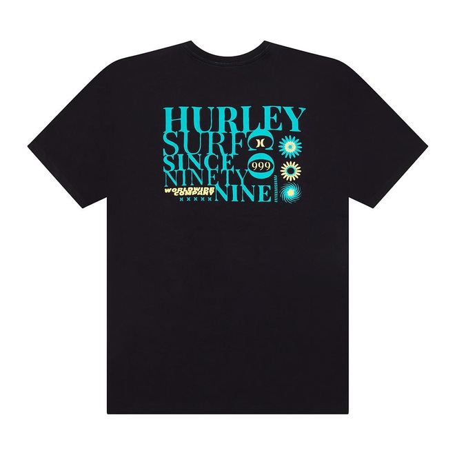 Camiseta Hurley feita em meia malha 30.1, gola rebatida, estampa localizada base d'agua e etiqueta clips ONE&ONLY na barra.