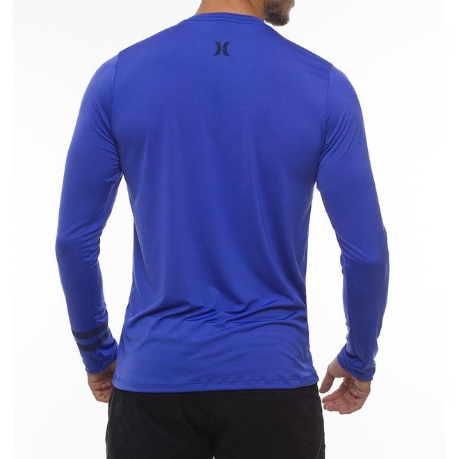 Camsieta Hurley surf tee manga longa com tecido com elastano, estampa frontal, estampa block party na manga, tecido com proteção UPF 50+ e etiquetas personalizadas.