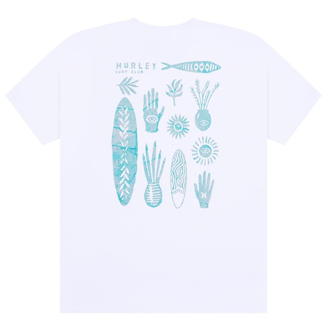 Camiseta Hurley feita em meia malha 30.1, gola rebatida, estampa localizada base d'agua e etiqueta clips ONE&ONLY na barra.