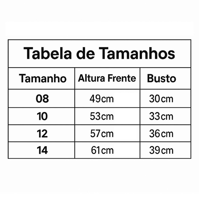 Tabela de Tamanhos (Altura Frente x Largura Busto):