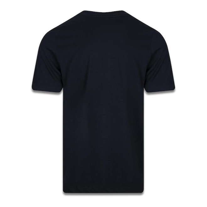 A camiseta masculina é de mangas curtas, com gola careca e tira interna em tecido que ajuda a diminuir o atrito de contato com a costura.
