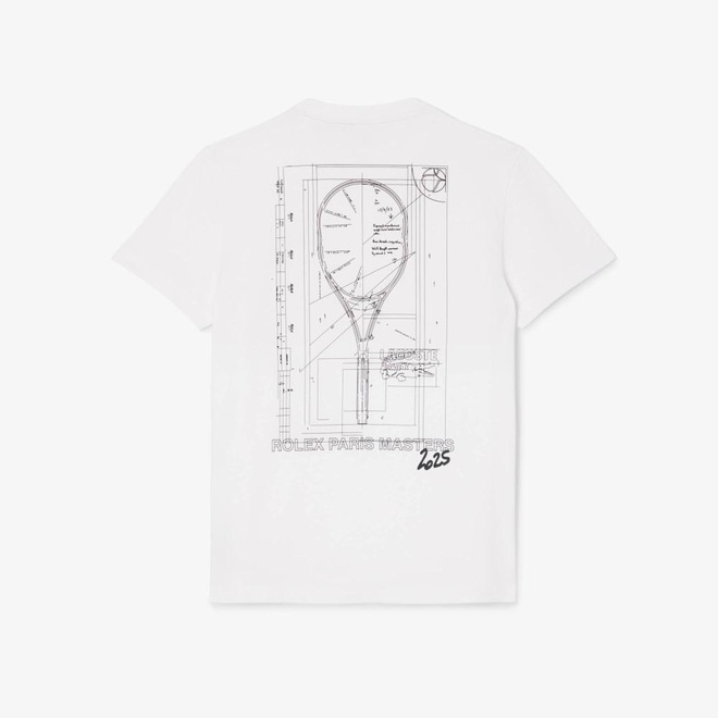 Essa camiseta exclusiva da Lacoste, parceira premium do torneio Masters Paris Rolex, é a última palavra em elegância e design especializado. Feita com nossa malha de algodão confortável, com uma estampa grande multimarca, exibindo um desenho técnico de uma raquete pertencente ao nosso fundador René Lacoste. Acabada com o crocodilo típico bordado.
